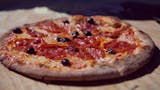 Organic crust, vegan mozzarella & gluten-free/ vegan pepperoni, tomato sauce, and kalamata olives.